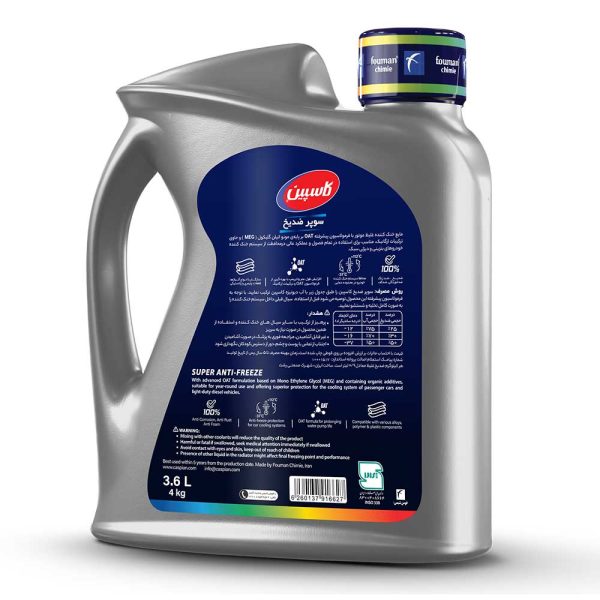 سوپر ضدیخ کاسپین مطابق با استاندارد ۳۳۸ ایران و با فناوری OAT در حداکثر سازگاری با فناوری موتورها و با آبوهوای ایران فرموله شده است و در محدوده دمایی ۳۷- درجه سانتیگراد تا ۱۱۲+ سانتیگراد قابل استفاده است. این ضدیخ غلیظ میباشد و برای دستیابی به مناسبترین محدوده دمایی باید مطابق با جدول مندرج بر روی لیبل ضدیخ با آب دیونیزه و یا آب مقطر رقیق شود .